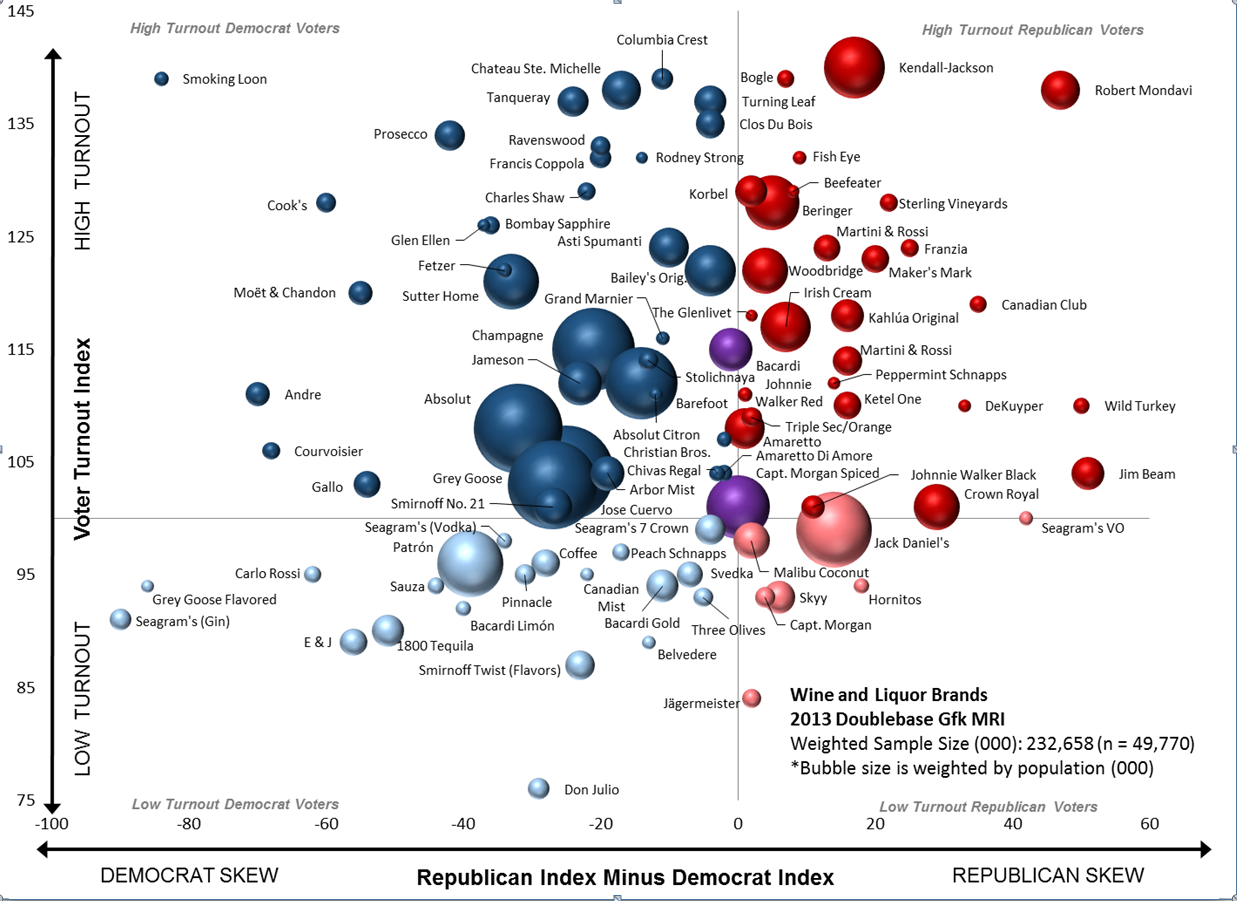 Democratic drinkers are more likely to sip Absolut and Grey Goose vodkas, while Republican tipplers are more likely to savor Jim Beam, Canadian Club and Crown Royal. That research comes from consumer data supplied by GFK MRI, and analyzed by Jennifer Dube of National Media Research Planning and Placement, an Alexandria-based Republican consulting firm.